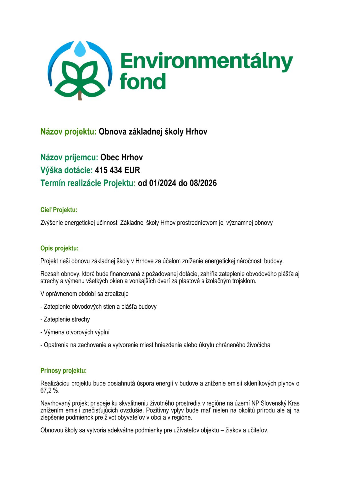 Environmentálny fond : ’’Obnova ZŠ Hrhov’’